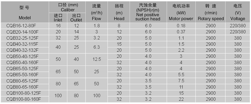 CQB-F型衬氟磁力泵的过流部件均采用“聚偏二氟塑料合金(PVF2)和超高分子量聚乙烯(UHMWPE)”制造。在常温下,PVF2对卤素、卤代烃、强氧化剂、沸酸、碱等多种有机溶剂都有良好耐蚀性;UHMWPE对非氧化性酸(稀硫酸、硝酸及浓度较大的盐酸、磷酸、氢氟酸、甲酸、乙酸)、氨和胺及各种碱、盐溶液都有良好的耐蚀性,两种材料都不耐强氧化性酸的腐蚀。氟合金泵的外壳为金属材料,有足够的强度承受管道以及外界的机械冲击。传动功率3kW以下的采用全氟结构。